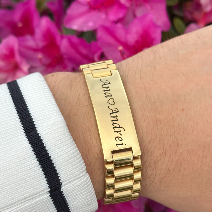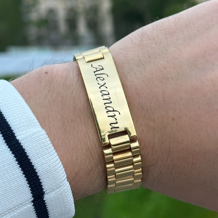 Brățara personalizată cu nume întoarce orice privire. Fabricată din oțel inoxidabil și placată cu aur de 24 Karate aplică o nuanță sclipitoare de culoare aurie ce nu se înegrește cu timpul.