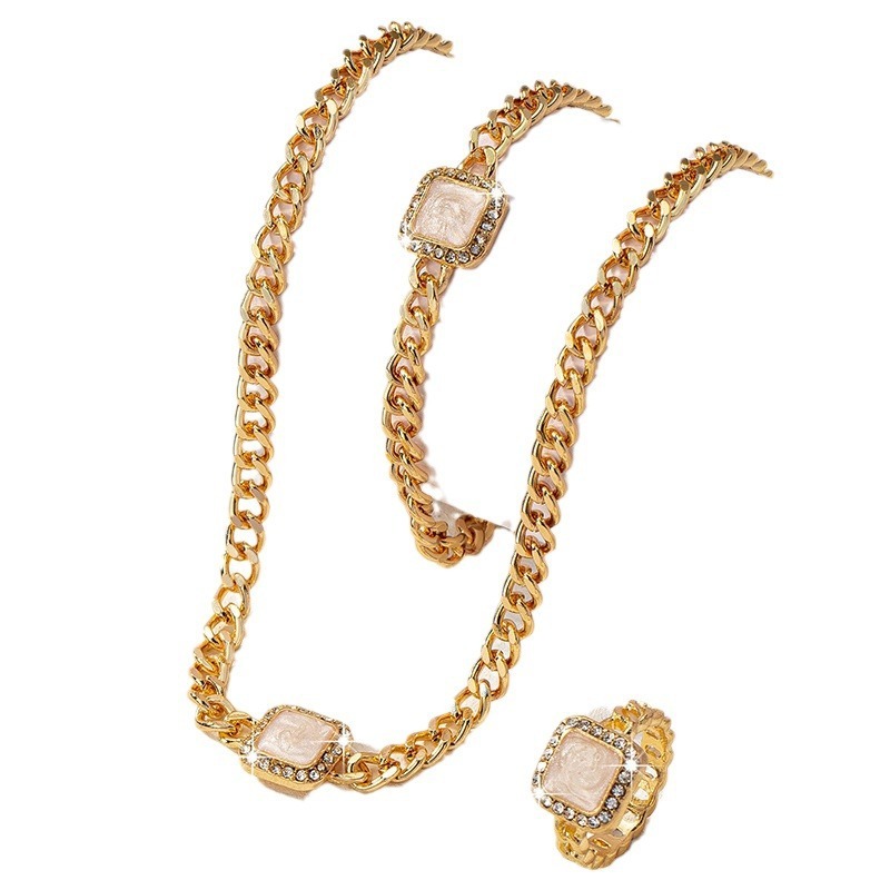 Acest set elegant de bijuterii este compus dintr-un colier, o brățară și un inel, toate realizate din metal placat cu aur și decorate cu un element central sub formă de piatră pătrată, cu finisaj perlat și margini strălucitoare. Designul minimalist și rafinat al acestui set îl face ideal pentru ocazii speciale sau pentru a adăuga o notă sofisticată ținutelor de zi cu zi. Lanțurile solide conferă un aspect modern și durabilitate. Este un set versatil, perfect pentru femeile care doresc să emane eleganță și stil.